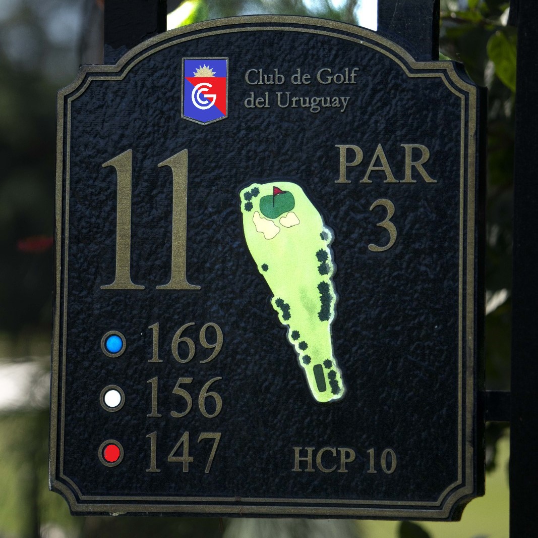 Si analizamos este cartel podemos leer que 11 es el número de hoyo, a su lado está el plano del mismo. El “par” significa el número “ideal” de golpes que un jugador ha de dar hasta introducir la bola en el hoyo, que en este caso es 3. Los tres números son las distancias en yardas para Damas 147, Caballeros 156 y para Profesionales 169 y HCP 10 o sea hándicap 10 indica la dificultad.